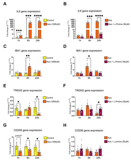 To elucidate the mechanisms underlying AZE-induced inflammatory profile, and assess whether these could be reversed by L-proline supplementation, we examined the expression of common pro- (IL6 and IBA1) and anti-inflammatory genes (CD206) in BV2 microglia exposed to AZE only or in combination with L-proline after 1, 6 and 24 h by real-time quantitative polymerase chain reaction (qPCR). Additionally, we also investigated the expression levels of TREM2 mRNAs, whose expression is repressed in microglia upon exposure to pro-inflammatory stimuli [25]. As illustrated in Figure 2A, AZE treatment reliably increased the gene expression of the pro-inflammatory cytokine IL6 already after 1 h treatment (*** p < 0.001 vs. control; Figure 2A), which further increased (> 600 folds) at 6 and 24 h (*** p < 0.001 and **** p < 0.0001 vs. control, respectively). Whilst L-proline co-administration was unable to prevent AZE-driven IL6 induction at 1 h (p > 0.05), it remarkably diminished IL6 mRNAs at 6 h (*** p < 0.001 vs. AZE) and at 24 h (**** p < 0.0001 vs. AZE; Figure 2B). IBA1 gene expression was not increased in response to AZE after 1 h (p > 0.05); however, gene expression was significantly up-regulated at 6 h (** p < 0.01 vs. control; Figure 2C), but not at 24 h (p > 0.05 vs. control) corroborating our previous data [7]. Accordingly, L-proline completely prevented IBA1 up-regulation caused by AZE treatment at 6 h (* p < 0.05 vs. AZE; Figure 2D), with minor and non-significant effects at 1 and 24 h (p > 0.05 vs. AZE). We also found that TREM2 expression was reduced by AZE at both 1 and 24 h (* p < 0.05 vs. control for both; Figure 2E), but not at 6 h (p > 0.05). L-proline addition to the culture media normalized the expression of TREM2 to control levels both at 1 and 6 h (p > 0.05 vs. AZE), and significantly increased TREM2 transcripts at 24 h (* p < 0.05 vs. AZE; Figure 2F).