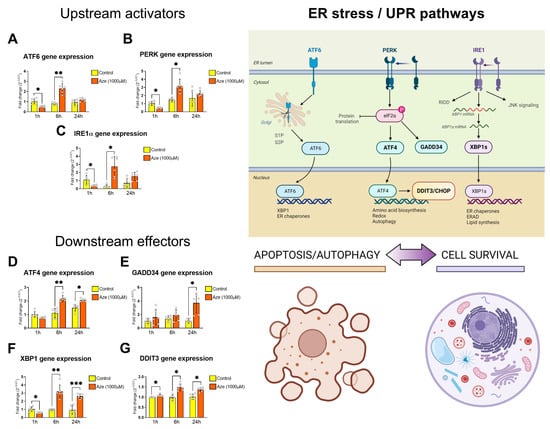 In line with the above results, key downstream effectors of the ER stress/UPR pathways (ATF4, GADD34, XBP1 and DDIT3; please refer to the diagram in Figure 3) were globally up-regulated after AZE treatment (Figure 3D–G). Specifically, ATF4 mRNAs were significantly increased starting from 6 h (** p < 0.01 and * p < 0.05 vs. control at 6 and 24 h, respectively; Figure 3D). GADD34 gene expression was not affected until the 24 h time point, where we report a significant increase (* p < 0.05 vs. control; Figure 3E). The XBP1 gene was increased as early as after 1 h post-AZE treatment (* p < 0.05 vs. control; Figure 3F) and was followed by a progressive increase at 6 h (** p < 0.01) and 24 h (*** p < 0.001). Finally, DDIT3 gene expression was increased by AZE treatment after 1, 6 and 24 h (* p < 0.05 at all of the time points tested; Figure 3G).