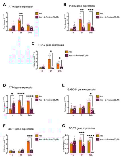 Accordingly, downstream UPR effector genes were also reduced upon L-proline co-administration (Figure 4D–G). Specifically, after inducing an early ATF4 gene up-regulation at 1 h (* p < 0.05 vs. AZE; Figure 4D), L-proline co-supplementation strongly reduced ATF4 mRNAs at both 6 and 24 h (**** p < 0.0001) (Figure 4D). In contrast, L-proline had no effects on AZE-driven GADD34 mRNAs at 1 and 6 h (p > 0.05), whose expression levels were only reduced at the latest time point tested (* p < 0.05 vs. AZE; Figure 4E). XBP1 gene expression also showed a similar pattern of gene regulation as GADD34, with a significant reduction recorded only after 24 h L-proline co-treatment (*** p < 0.001 vs. AZE; Figure 4F). DDIT3 gene expression was unaffected by L-proline co-administration at 1 h (p > 0.05 vs. AZE; Figure 4G) but was robustly reduced after 6 h (*** p < 0.01) and even more so after 24 h (**** p < 0.0001; Figure 4G).