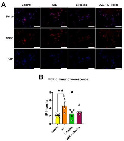 As depicted in the representative photomicrographs shown in Figure 5A, and as confirmed by IF quantification, AZE treatment significantly increased PERK immunoreactivity (** p < 0.01 vs. control; Figure 5A,B). The co-presence of L-proline in the culture media was sufficient to prevent AZE-driven PERK induction, as demonstrated by a significant reduction in IF intensity in AZE + L-proline treated cells (# p < 0.05 vs. AZE; Figure 5A,B). No significant effects were seen in cells treated with L-proline alone.