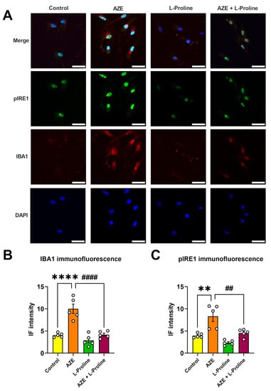 As shown in Figure 6, AZE treatment caused a robust induction of IBA1-immunoreactivity in primary microglia (**** p < 0.0001 vs. control; Figure 6A,B), which was abrogated in cells co-treated with L-proline (#### p < 0.0001 vs. AZE; Figure 6A,B). Similarly, pIRE1 reactivity was significantly increased upon exposure to AZE (** p < 0.01 vs. control; Figure 6A,C) and prevented by L-proline co-treatment (## p < 0.01 vs. AZE; Figure 6A,C). Noteworthy, L-proline treatment alone had no effects on either IBA1 or pIRE1 immunoreactivity (Figure 6A–C).
