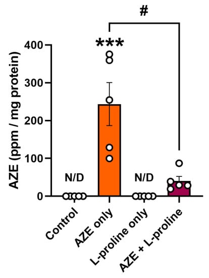 As expected, Figure 7 shows that no AZE-bound proteins could be detected in control or L-proline-treated cells. Administration of AZE to the culture media (1000 μM) caused a robust increase in AZE-containing protein fractions (*** p < 0.01 vs. control; median = 254.4 ppm/mg protein; Figure 7). Co-supplementation of L-proline almost completely prevented AZE incorporation into proteins, with ~84% reduction in AZE-bound proteins (# p < 0.05 vs. AZE only, median abundance = 29.49 ppm/mg protein; Figure 7).