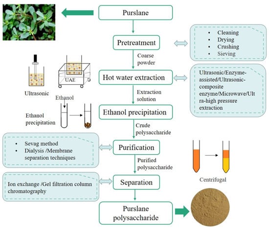 In conclusion, obtaining polysaccharides from purslane requires the steps of extraction, separation and purification. Each step of treatment may affect its yield, structure and activity. Therefore, it is important to carefully select suitable, reasonable, safe and effective extraction and purification methods.