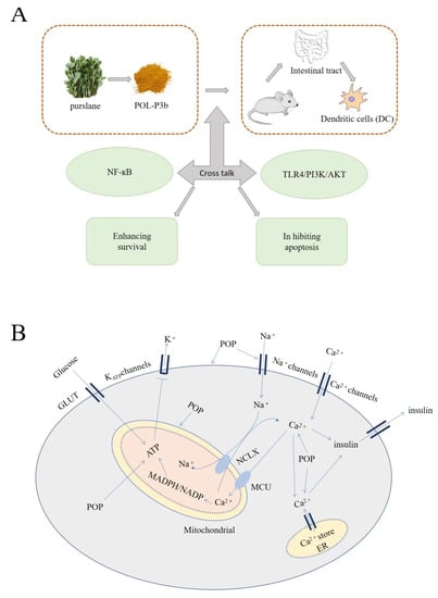 Another study showed that Purslane polysaccharides (POP) also have antidiabetic effects (Figure 4). The INS-1 cells’ viability was determined by 3-(4,5-dimethylthiazol-2-yl) 2,5-diphenyltetrazolium (MTT) assay [49]. INS-1 cells were seeded in culture dishes for 24 h. The medium was then removed and replaced with fresh medium containing POP (0.01–5 mg/mL) or TTX (0.1–1 μM). Insulin concentrations in culture medium and cell protein extracts were then determined. ATP Assay kit and photometer were used to determine ATP in cell lysate, and then the amount of ATP was determined by standard ATP curve. Glucose-stimulated insulin secretion (GSIS), intracellular Ca2+, mitochondrial membrane potential and membrane potential (MP) were measured in INS-1 cells. The results showed that POP and TTX (tetrodotoxin, a VGSC specific blocker) increased the concentration of insulin in the culture medium and the concentration of insulin in INS-1 cells under different concentrations of glucose. However, the effect of POP on insulin secretion and production was blocked by VGSC blocker TTX. POP also increased mitochondrial membrane potential, adenosine triphosphate (ATP) production, depolarization MP and intracellular Ca2+ level. In addition, in order to determine whether POP regulates the expression of VGSC, the expression levels of VGSC subunits NaV1.3 and NaV1.7 in INS-1 cells were detected. Western blotting analysis showed that POP treatment increased the expression level of Nav1.3 and decreased the expression level of Nav1.7. The above results indicate that POP may regulate insulin secretion through VGSC, and can also change intracellular Ca2+ release, ATP metabolism, cell membrane and mitochondrial membrane potential [26]. Based on the above studies, it can be speculated that purslane polysaccharides can be used as antidiabetic therapeutic agents. Although the research on their antidiabetic mechanism is limited, it can be inferred from the above studies that purslane polysaccharides have an antidiabetic effect and show good therapeutic effect. Therefore, they have the potential to develop new antidiabetic drugs with low toxicity.
