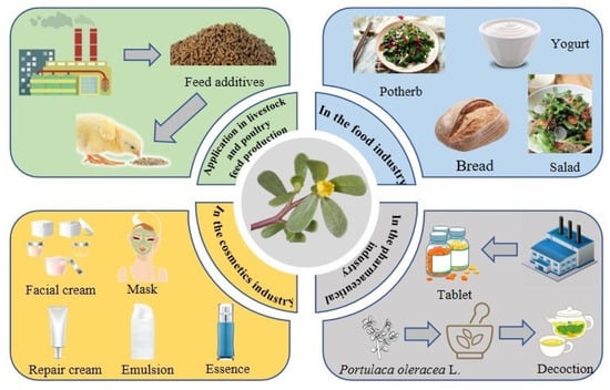 Portulaca oleracea L. (purslane) belongs to the Portulaceae family and is an annual herbaceous plant. It originated in India, and has been distributed in multiple regions around the world, mainly in temperate and tropical regions such as Asia, Africa, Europe, etc. [1,2]. In different countries and language systems, the name purslane is different: it is called “rigla” in Egypt, “pigweed” in England, “pourpier” in France and “Ma-Chi-Xian” in China (Figure 1). In addition, some of its aliases can reflect its properties. In Brazil, it is called “unconventional edible plant”, which means it does not belong to a specific region or country and can even be consumed by most of the world’s population. In China, it is known as “vegetable for long life” due to its multiple benefits to the human body. Purslane is rich in nutrients such as malic acid, glucose, calcium, phosphorus and iron, as well as carotene and vitamins B, C and E. Regular consumption of purslane not only supplements the body with many nutrients, but also enhances immunity, lowers blood sugar and blood lipids and has a positive effect on protecting the eyes [3]. There are various ways to eat purslane; it is suitable for both fresh and dry food. It can be cold-mixed, stir-fried, or boiled in soup. It tastes delicious and refreshing, so it also has the effect of promoting appetite [4].