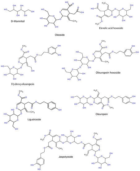 This type of monoterpene is widely distributed in the Oleaceae (Obied et al., 2008) [20]. It is to be noted that their fragmentation patterns are consistent with previous works [10,14,21].