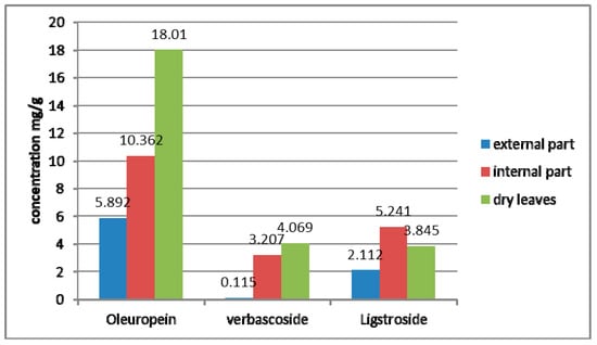 Figure 2 illustrates a comparison between the content of selected compounds in roots and dry leaves studied by Talhaoui et al. [13]. The oleuropein content in olive roots varies from 5.892 to 10.362 mg/g, while that in leaves is around 18.01 mg/g. The verbascoside concentration in dry leaves is around 4 mg/g, while in the inner part of olive roots it amounts to 3.207 mg/g. Moreover, the ligesroside content of olive roots (5.241 mg/g) is higher than that of olive leaves (3.845 mg/g).
