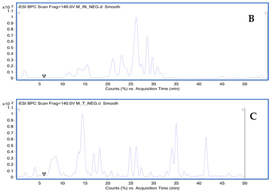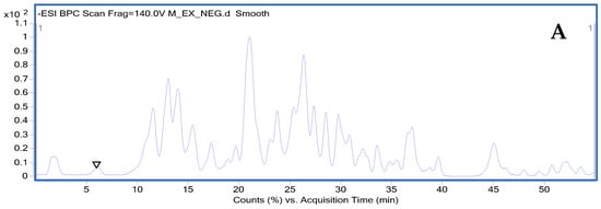 Base peak chromatogram (BPC) of the olive root methanol extract obtained by HPLC-DAD-ESI-MS in the negative ionization mode ((A)—chromatogram of the extract from the outer part of the olive tree root; (B)—chromatogram of the extract from the inner part of the olive tree root; (C)—chromatogram of the extract from the olive tree whole roots).