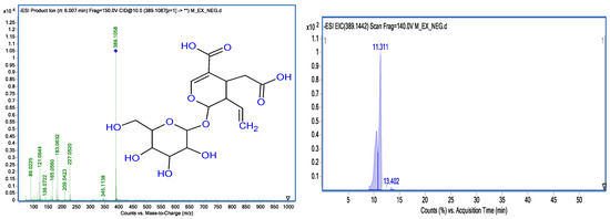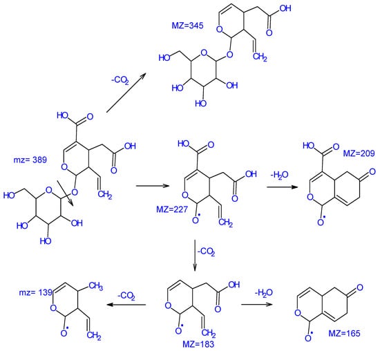 Iridoids are known to offer a wide range of health benefits, including resisting a wide assortment of physical, biological, and chemical stressors. Multiple scientific studies have highlighted that iridoids possess antioxidant, antibacterial, anti-cancer, and anti-viral properties. Iridoids have been identified in olive tree root extracts. Among the most important ones, we state loganic acid (C16H24O10) (375.12 m/z) with main fragments at (213.0763 m/z), (341.1061 m/z); secologanosid (389.1087 m/z) (C16H22O11) (Figure 4); and main fragments at (345.1138 m/z), (183.0676 m/z), (121.0673 m/z), and (227.0571 m/z) related to the loss of (C6H11O5), (89.0225 m/z), and (165.0560 m/z). Relying on the spectrophotometric data, Figure 5 illustrates a proposed mechanism for the fragmentation of secologanosid. The appearing peak has a retention time of 19.35 min (359.13 m/z), and the fragments (197.0814 m/z), (153.0922 m/z), (135.0815 m/z), and (109.0668 m/z) have been identified as 7-deoxyloganic acid (C16H24O9). The peak with a retention time of 11.24 min (389.14 m/z) and the fragments (345.1559 m/z), (115.0395 m/z), (301.1637 m/z), (151.0773 m/z), (101.0252 m/z), and (83.0132 m/z) were identified as loganin.