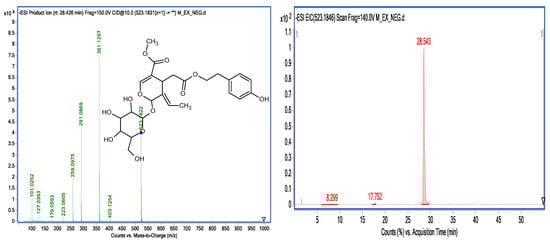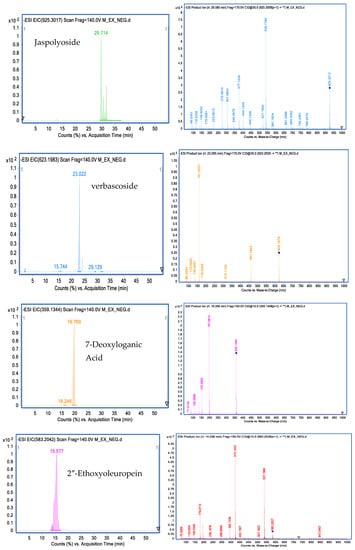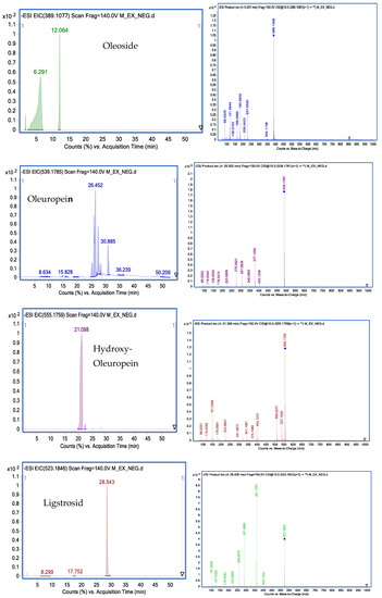 Secoiridoids are the major class of secondary metabolites identified in olives. Among them, oleuropein corresponds to the major compound in leaf, stem, and root extracts. Several secoiridoids were detected in the extracts, and all were identified by comparing their ECs and fragmentation pathways to those found in the literature and databases [10,16].