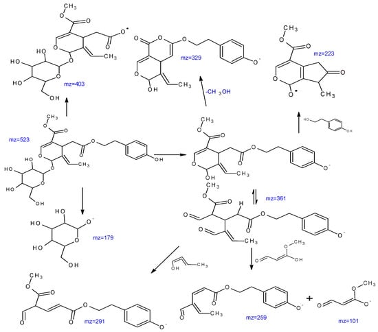 A total of 22 known secoiridoids have been tentatively identified in olive roots. They notably correspond to oleoside (C16H22O11) (389.1087 m/z), acyclodihydroelenolic acid hexoside I (C17H28O11) (407, 1559 m/z), oleoside methyl ester derivative (C18H30O11) (421.1697 m/z),elenolic acid hexoside(C17H24O11) (403.1243 m/z) methyl oleuropeinaglycone (C17H28O10) (391.1602 m/z), 2″-ethoxyoleuropein (C27H36O14) (583.2032 m/z), hydroxyoleuropein (C25H32O14) (555.1759 m/z), demethyloleuropein (C24 H30 O13) (525.1618 m/z), oleuropein hexoside (C31H42O18) (701.2319 m/z),oleuropein hexoside (C31H42O18) (701.2304 m/z), methoxyoleuropein (C26H34O14) (569.498 m/z), dihydrooleuropein (543.2316 m/z), oleuropein (C25H32O13) (539.1781 m/z), lucidumoside C (C27H36O14) (583.1732 m/z), 60-O-[(2E)-2.6-dimethyl-8-hydroxy-2-octenoyloxy]-secologanoside (C26H38O13) (557.2225 m/z), ligustroside (C25H32O12) (523.1822 m/z), ligstrosideaglycone (C19H22O7) (361.1193 m/z), jaspolyoside (C42H54O23) (925.3006 m/z), hydroxyoleuropeinaglycone (C19H22O9) (393.1194 m/z) and oleuropein derivate (C35H46O15) (705.2774 m/z), elenolic acid hexoside derivative (C19H26O13) (461.1301 m/z) and nuezhenide (C31H42O17) (685.2371 m/z). We opted to characterize two compounds by examining their MS and MS/MS spectra. Oleuropein at 25.586 min is present at (539.1811 m/z) (C25H31O12). Two main fragments at (403.1217 m/z) and (377.1217 m/z) are obtained by the loss of the (C8H9O2) moiety as well as the loss of the glucose residue group of the deprotonated molecular ion (539.1811 m/z). Other characteristic fragments can be detected, such as (275.0898 m/z), which is characteristic of the loss of (C4H6O3) from (377.1217 m/z), and (307.0792 m/z), which is characteristic of the loss of (C4H6O) from (377.1217 m/z). Ligstroside at 28.42 min, another well-known compound of the Oleaceae family, is present with 523.1811 m/z(C25H31O12) (Figure 6). The main fragment (361.1277 m/z) is obtained by the loss of a glucose residue from the deprotonated molecular ion (523.1811 m/z). Other characteristic fragments can be observed, such as (291.0865 m/z), obtained through the loss of (C4H6O) from (361.1297 m/z), and (259.0975 m/z), characteristic of the loss of (CH3OH) from (291.0865 m/z). Figure 7 depicts a proposed mechanism for the fragmentation of ligstroside. The fragmentation model was checked through comparison with previous studies [22].