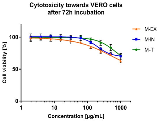 The dose-response effect of the extracts (external part M-EX, internal part M-IN, and all the roots M-T) on the viability of VERO cells is portrayed in Figure 9. The exact CC50 values (concentrations of the tested extract decreasing the cellular viability by 50%) could not be assessed but were above 500 µg/mL for all tested extracts. According to a previously published work [24], no significant cytotoxicity of plant extract is recorded when the CC50 is above 500 µg/mL.