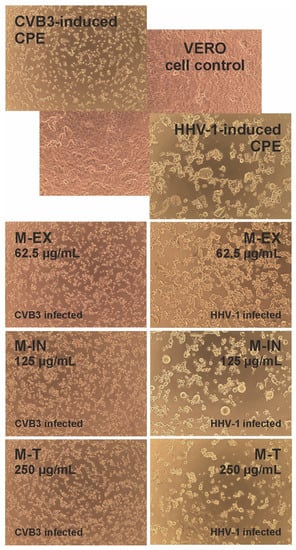 The influence of extracts on viral-induced cytopathic effects (CVB3—Coxsackievirus B3; CPE—cytopathic effect; HHV-1—Human Herpesvirus type 1; M-EX—external part; M-IN—internal part; M-T—whole roots).