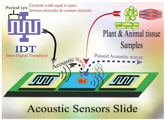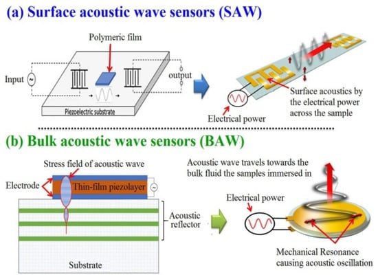 For example, the expression of AWSs occurs due to their detection mechanism based on the mechanical movements that cause acoustic waves to be considered and characterized [6]. These waves are moved on the surface of the material or through them. Any changes in the material characteristics could affect the velocity and/or amplitude of the hit acoustic waves and then could be sensitively detected and correlated to the corresponding physicochemical material measured [7,8].