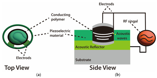 Schematics of bulk acoustic wave (BAW) chemical sensors. (a) Vertical top view. (b) Side view of BAW sensor system [54,55].