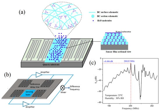 The adequate enrichment of acoustic sensors is more effective to improve their detection sensitivity. In this context, chemical analysis technologies should serve with the technological studies to achieve the goal of adding the beneficial essential elements to improve the stability and accuracy of the acoustic sensor for enhancing its feasibility as a worldwide distributed functional chemical analysis technology [61]. For example, the acoustic sensor enriched with powder bacterial cellulose showed benefits in many aspects such as high-sensitivity characteristics [62]. Meanwhile, SAW torque sensors are utilized in practical applications with their centerlines at right angles and their sensitivity to temperature drift; the mass loads make several applications possible for these kinds of sensors, such as their film thickness sensors and particle sensors. The sensor transforms into a particulate sensor if it is covered with an adhesive substance; any particle that lands on the surface stays there and disrupts wave propagation. A 200 MHz ST-cut quartz SAW has been reported to have a mass resolution of 3 pg, which is 1000 times more sensitive than the tested 10 MHz TSM resonator. Wang, Guo, Li, Long, Tang, Zu, Ma, Du, Tang, Torun and Fu [62] developed a SAW for tracking the media humidity as a sensor based on bacterial cellulose (BC) coated by quartz. The authors mentioned that the BC-SAW sensor exhibited good short-term repeatability and long-term stability for the media humidity sensation (Figure 5).