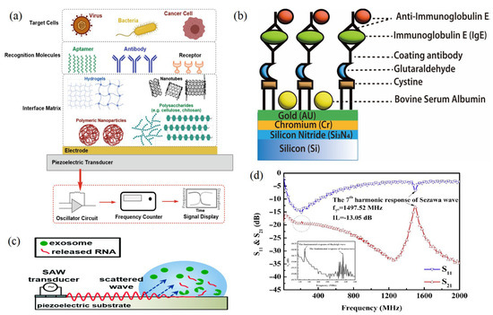 (a) Components of an acoustic biosensor to capture whole cells. (b) Schematic diagram for the SAW sensor integration of cystamine, glutaraldehyde, and IgE antibody/antigen multilayer. (c) Schematic of SAW-based lysing of exosomes to release RNA for detection [24]. (d) Frequency response of the Sezawa-mode SAW device [32,68] (copyright permission no: 5543441314248).
