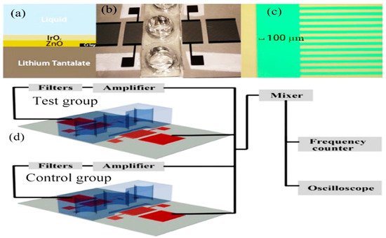 (a) Double-layer construction SAW sensor. (b) Fabricated resonator and fluidic well. (c) Microscopic image of the finger pairs. (d) Potential experimental setup illustration [108] (copyright permission: 5567480548369).