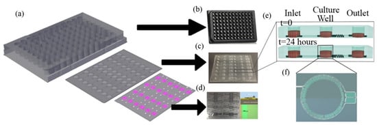 Design of the SAW-based gravitational microfluidic system. (a) Microfluidic 96-well plate with integrated sensor layer at the bottom. (b) Bottomless 96-well plate. (c) Microfluidic channel layer. (d) Surface-acoustic-wave (SAW)-based sensor layer. (e) 3D vertical image of the well fluid levels at 0 h and after 24 h. (f) A real image horizontal view of the culture well (copyright permission: 5567500483871).
