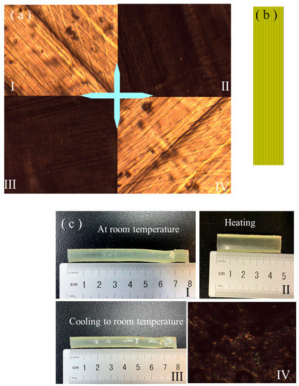 (a) POM images of the strip-shaped LCE. The crossed arrows denote the horizontal analyzer and vertical polarizer. (a-I) The stretching direction inclined at −45° to the polarizer. (a-II) The stretching direction parallel to the polarizer. (a-III) The stretching direction parallel to the analyzer. (a-IV) The stretching direction inclined at 45° to the polarizer. (b) The schematic alignment distribution in the strip-shaped LCE. (c) Images of the states of strip-shaped LCE initially on a hot stage at room temperature (c-I), when being heated to 80 °C (c-II), when being cooled to room temperature (c-III), and a POM image of strip-shaped LCE being heated at 80 °C (c-IV).