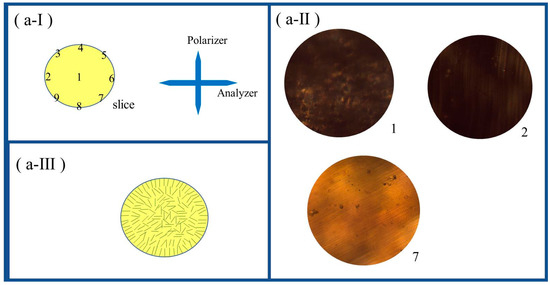 (a-I) Schematic illustration of the selected coordinate locations, marked as 1 to 9, in a transversely cut slice of rod-shaped LCE, for POM measurement. The crossed arrows denote the horizontal analyzer and vertical polarizer. (a-II) POM images captured at coordinate location 1, 2, and 7. (a-III) Schematic illustration of alignment distribution in cross-section of the rod-shaped LCE. (b) Images of the states of rod-shaped LCE initially on a hot stage at room temperature (b-I), when being heated to 80 °C (b-II), when being cooled to room temperature (b-III), and a POM image of a transversely cut slice of rod-shaped LCE being heated at 80 °C (b-IV).