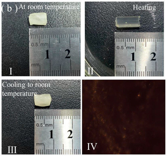 The two fabricated LCEs with 1D-programmed shapes had a rectangular strip and round rod shape, as expounded in S-Ⅱ of the ESI †. Figure 1a shows a POM observation of the strip-shaped LCE. The LCE exhibited the brightest transmittance when its stretching direction was at an angle of ±45° with the polarizer or analyzer (Figure 1(a-I,a-IV)), whereas extinctive transmittance was found when its stretching direction was parallel or perpendicular to the polarizer or analyzer (Figure 1(a-II,a-III)); this revealed that the mesogens were axially aligned along its stretching direction [1], as illustrated in Figure 1b. The thermal actuation behavior of the strip-shaped LCE was examined on a program-controlled hot stage, as shown in the images in Figure 1c. Upon heating to 80 °C, it contracted along the length direction, which was the alignment direction, and expanded along the width direction. Upon cooling to room temperature, it returned to its initial length and width. This reversible thermal-induced deformation was caused by the reversible phase transition between the alignment structure and isotropic state upon undergoing the heating and cooling process [1,2,3,4,5,6]. Upon being heated to 80 °C, the strip-shaped LCE demonstrated a dark pattern under the POM regardless of the angle that it was at relative to the polarizer or analyzer, and this was due to its isotropic state, as shown in Figure 1(c-IV). When the LCE network transitioned from the LC phase to an isotropic state, it contracted along the alignment direction and expanded along the directions that were perpendicular to the alignment [1]. We found that the resulting length and width of the rectangular strip-shaped LCE, after being heated above the Tni (about 62 °C [75]), were basically consistent with those of the partly crosslinked polydomain LCE with a rectangular strip shape after undergoing the first crosslinking step, as expounded in S-II and illustrated in Scheme S1 of the ESI †. This revealed that the LCE demonstrated two-way shape memory between the initial shape formed after the first crosslinking step and the mechanically programmed shape that was fixed by the second crosslinking step. This two-way shape memory was induced by the two-way network memory between the first- and second-network structure that was generated during the two-step crosslinking process [70].