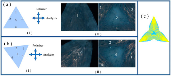 (a-I) Schematic illustration of the selected locations, with number markings, in the LCE sample with a regular triangle shape for POM measurement. The crossed arrows denote the horizontal analyzer and vertical polarizer. (a-II) POM images captured at the selected locations of regular-triangle-shaped LCE. (b-I) Schematic illustration of LCE sample of regular-triangle shape, with locations marked, being rotated right by 45°. (b-II) POM images captured at the selected locations of regular-triangle-shaped LCE that was rotated right by 45°. (c) Schematic illustrations of alignment distributions in regular-triangle-shaped LCE.