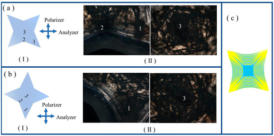 (a-I) Schematic illustration of the selected locations, with number markings, in the LCE sample with a four-pointed-star shape for POM measurement. The crossed arrows denote the horizontal analyzer and vertical polarizer. (a-II) POM images captured at the selected locations of four-pointed-star-shaped LCE. (b-I) Schematic illustration of LCE sample of four-pointed star shape, with location markings, being rotated right by 45°. (b-II) POM images captured at the selected locations of four-pointed-star-shaped LCE that was rotated right by 45°. (c) Schematic illustrations of alignment distributions in four-pointed-star-shaped LCE.