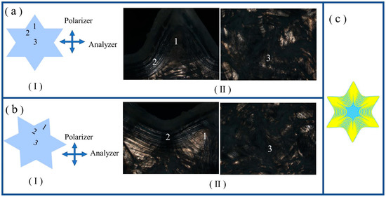 (a-I) Schematic illustration of the selected locations, with number markings, in the LCE sample with a six-pointed star shape for POM measurement. The crossed arrows denote the horizontal analyzer and vertical polarizer. (a-II) POM images captured at the selected locations of six-pointed-star-shaped LCE. (b-I) Schematic illustration of LCE sample of six-pointed star shape, with location markings, being rotated right by 30°. (b-II) POM images captured at the selected locations of six-pointed-star-shaped LCE that was rotated right by 30°. (c) Schematic illustrations of alignment distributions in six-pointed-star-shaped LCE.