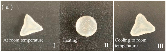The shape changes in LCEs are governed by the coupling between the LC orientations and anisotropic polymer networks, and they rely on a reversible nematic–isotropic transition that is associated with LC moieties. When heated above the nematic–isotropic transition temperature (Tni), the alignment order of the LC moieties is disrupted, and the LCE transfers from the nematic LC phase into the isotropic state, which drives the macroscopic shape change. Upon cooling below Tni, the alignment order and LC phase are recovered, and the LCE reverts to its initial shape [1]. The spatial distribution of the LC molecule alignment determines the shape-shifting behavior of the LCEs. Uniaxial alignment can only lead to simple shape-morphing modes such as in-plane contraction and elongation or bending and unbending [1,2,3], and these simple modes cannot meet the development requirements for versatile 3D shape-morphing modes.
