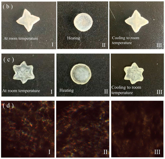 (a–c) Images of the states of regular-triangle-shaped LCE (a), four-pointed-star-shaped LCE, (b) and six-pointed-star-shaped LCE (c) initially on a hot stage at room temperature (a-I–c-I), when being heated to 80 °C (a-II–c-II), and when being cooled to room temperature (a-III–c-III). (d) POM images of the regular-triangle- (d-I), four- (d-II), and six-pointed-star-shaped LCE (d-III) when being heated at 80 °C.