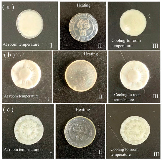 Images of the states of 3D-S-LCE (a), 3D-E-LCE (b), and 3D-SE-LCE (c) initially on a hot stage at room temperature (a-I–c-I), when being heated to 80 °C (a-II–c-II), and when being cooled to room temperature (a-III–c-III).