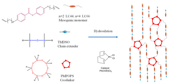 The mesogens (LC units), which were 4-(but-3-en-1-yloxy)phenyl 4-(but-3-en-1-yloxy)benzoate (LC44) and 4-(hex-5-en-1-yloxy)phenyl 4-(hex-5-en-1-yloxy)benzoate (LC66), were synthesized by employing the methods outlined in our previously reported work [75]. The NMR measurement results of LC44 and LC66 were expounded in S-I and are shown in Figures S1 and S2 of the ESI †. The chain extender, cyclic siloxane crosslinker, and commercial platinum catalyst, which were 1, 1, 3, 3-teramethydisiloxane (TMDSO), 2, 4, 6, 8, 10-pentamethyl-1, 3, 5, 7, 9, 2, 4, 6, 8, 10-pentaoxapentasilecane (PMPOPS), and dichloro (1,5-cyclooctadiene) platinum (II) (Pt(COD)Cl2), respectively, were purchased from Aldrich (St. Louis, MO, USA). The catalyst solution was prepared by using the methods outlined in our previous work [75].