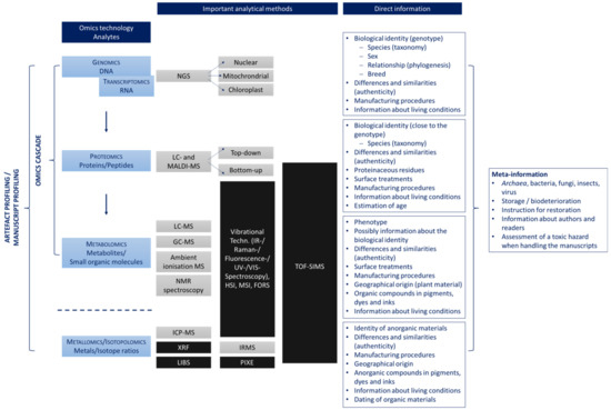 Omics disciplines that can be applied to the analysis of ancient artifacts including the analysis methods commonly used. High-resolution platforms typically applied for omics analysis are colored grey. Low-resolution methods are coloured black. They are also commonly applied for analysing ancient artefacts, but they do not offer the resolution and sensitivity required for omics approaches. In addition, it is shown for which scientific questions the different strategies can be used. While the direct information can be taken from the writing surfaces, inks, dyes, or pigments, meta-information results from residues from other organisms. Abbreviations: GC-MS, gas chromatography mass spectrometry; FORS, Fiber Optics Reflectance Spectroscopy; HIS, hyperspectral imaging; ICP-MS, inductively coupled plasma mass spectrometry; IR, infrared; IRMS, isotope ratio mass spectrometry; LC-MS, liquid chromatography mass spectrometry; LIBS, laser-induced breakdown spectroscopy; MALDI-MS, matrix-assisted laser desorption/ionisation mass spectrometry; MSI, multispectral imaging; NGS, next generation sequencing; NMR, nuclear magnetic resonance; PIXE, particle-induced X-ray emission; TOF-SIMS; time-of-flight secondary ion mass spectrometry; UV, ultraviolet; VIS, visible; XRF, X-ray fluorescence.