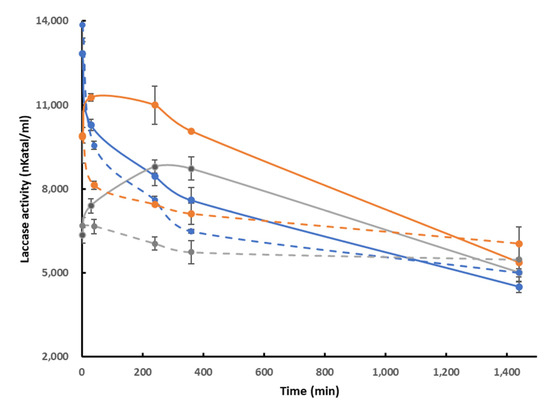 Time-course plot of the pH stability of laccase at pH 4.0 (blue), 4.5 (orange) and 5.0 (grey) in the presence (full line) and absence (interrupted line) of kraft lignin. Each datapoint (mean ± standard deviation) is the result of triplicate experiments.