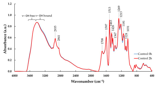 FTIR spectra of control kraft lignin incubated in pH 4.5 buffer without HBT for 0 and 2 h. Vertical lines indicate the main bands of lignin detailed in Table 1.