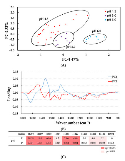 PCA analysis of the FTIR spectra in the 1800–700 cm−1 wavenumber range. (A) Score plot of PC2 (32%) vs. PC1(47%); (B) loadings profile highlighting the bands that contributed most to the separation of lignin samples (n = 38 samples). (C) Results of one-way ANOVA on 10 bands identified in the loadings profile. Laccase activated lignins at pH 4.5, 5.0 and 6.0 with 0 and 13 U g−1 lignin, with and without HBT, treated for 0, 0.5 and 2 h. Differences between pH levels of enzymatic treatment are significant at F statistic > 1 and p < 0.001 (in red) or p < 0.05 (in pink). The F test statistic is the ratio of two variances (variance between groups on variance within groups) and p value is the probability that determines if the difference between group means is statistically significant at 99.9% or 95%.