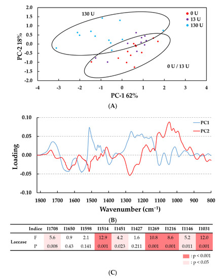PCA analysis of the FTIR spectra in the 1800–700 cm−1 wavenumber range. (A) Score plot of PC2 (18%) vs. PC1 (62%); (B) loadings profile highlighting the bands that contributed most to the separation of lignin samples (n = 34 samples). (C) Results of one-way ANOVA on ten bands identified on the loadings profile. Laccase activated lignins at pH 4.5 with 0, 13 and 130 U/g lignin, with and without HBT, treated for 0, 0.5 and 2 h. Differences between concentration levels of enzymatic treatment are significant at F statistic > 1 and p < 0.001 (in red) or p < 0.05 (in pink). The F test statistic is the ratio of two variances (variance between groups on variance within groups) and the p value is the probability that determine if the difference between group means is statistically significant at 99.9% or 95%.