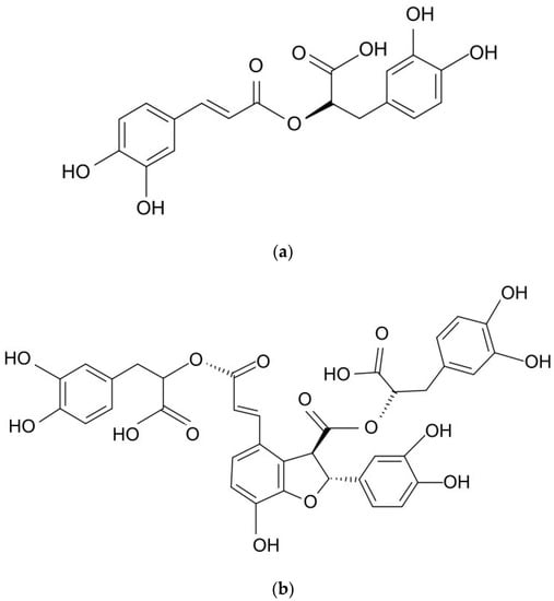 Previous studies have detailed a wide range of biotechnological approaches that can enhance the production of phenolic compounds via the cultivation of various plant parts, cells, tissues, and organs [7,8,9]. Although the biotechnological production of rosmarinic acid (RA; Figure 1a) has been intensively investigated, relatively few sources have examined the biotechnological efforts leading to enhanced production of lithospermic acid B (LAB; Figure 1b), also known as salvianolic acid B. Widely distributed in the plant kingdom, RA was found in all plants of the Boraginaceae family [10]. It is an ester of caffeic acid (CA) and 3,4-dihydroxyphenyllactic acid, while LA is a conjugate of RA and CA, and LAB is a dimer of RA [11,12].
