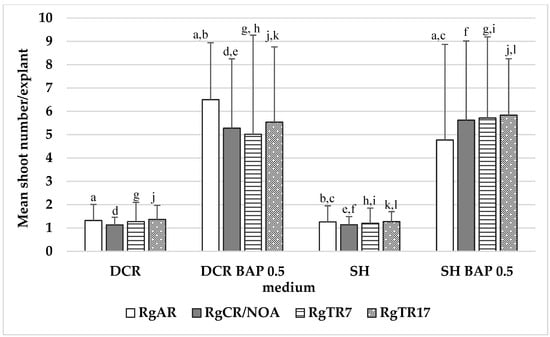 The number of auxiliary shoots formed per explant in Rindera graeca shoot cultures. Shoots were obtained via regeneration from roots and were cultivated on DCR and SH without growth regulators or supplementation with 0.5 mg/L BAP. Values represent means ± SD, and those marked with the same letter are statistically significant (p < 0.05). RgAR—shoots regenerated from anatomical roots; RgCR/NOA—shoots regenerated from auxin-induced roots; RgTR7—shoots regenerated from RgTR7 hairy roots; RgTR17—shoots regenerated from RgTR17 hairy roots.