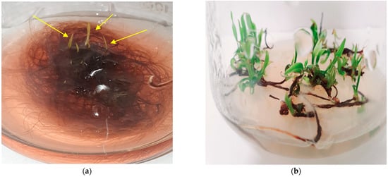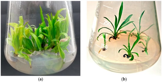 However, the quality of shoots developed on the DCR/BAP medium was superior to that formed on DCR/SV/KIN, in which the leaves in the rosettes were light green to yellow-green, which could be attributed to the reduced amount of salts and vitamins in the DCR/SV/KIN medium compared with the full-strength one (DCR). On the DCR/BAP medium, the shoots formed luxuriant rosettes composed of deep green leaves (Figure 3a). The approach of multiple shoot induction via direct organogenesis applied in the current study resulted in the growth of seven new shoots within four weeks, which seemed to be satisfactory [31]. When placed on the hormone-free DCR medium, the shoots spontaneously developed roots at their bases (Figure 3b).