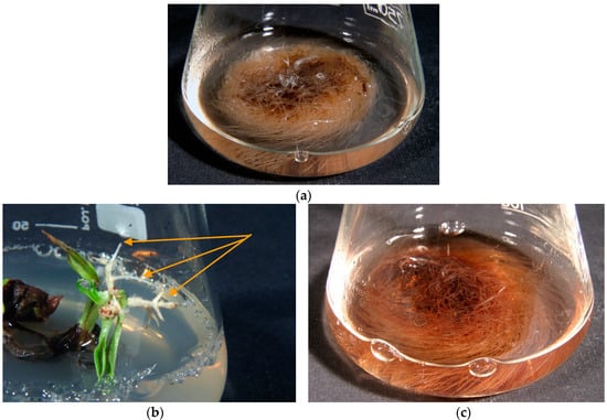 (a) Rindera graeca anatomical roots growing in liquid hormone-free SH media; (b) hairy roots emerging from R. graeca leaves (indicated by arrows) inoculated with the Agrobacterium rhizogenes ATCC 15834 strain after 4 weeks of culture; (c) hairy roots of RgTR17 line cultivated in liquid hormone-free DCR medium for 4 weeks.