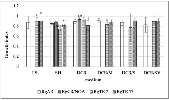 Growth index of Rindera graeca non-transformed and hairy roots. Means denoted with the same letter are statistically significant (p < 0.05).