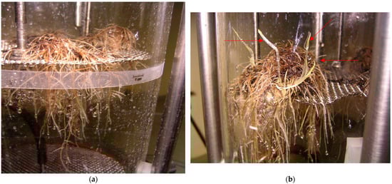The four-week-old shoots were infected with Agrobacterium rhizogenes strain ATCC 15834, as described by Pietrosiuk et al. [80]. On the basis of the visual evaluation, out of 60 roots emerging from the inoculation sites, two hairy root lines were chosen for further investigation. After excision, to remove the bacteria from their tissues, the roots were placed into 100 mL Erlenmeyer flasks containing 30 mL of liquid hormone-free LS medium [81] supplemented with 3% sucrose and Cefotaxime (500 mg/L), and they were cultivated for two weeks. The pH of the medium was adjusted to 5.6 prior to autoclaving. This procedure was repeated three times. The putative hairy roots were cultivated in a liquid hormone-free LS medium to examine the growth parameters. For this purpose, the LS medium and the four DCR medium modifications were used. The roots were cultivated on a 105 rpm gyratory shaker (INFORS, Bottmingen, Switzerland) in 250 mL Erlenmeyer flasks containing 50 mL of the medium, with a subculture to fresh medium every four weeks; the incubation was performed at 23 ± 1 °C in the dark. To determine the growth of roots, they were gently pressed onto filter paper to remove the medium and weighted, and their fresh weight (FW) was recorded. The root growth index was calculated by subtracting the fresh weight at the time of inoculation (time zero) from that at the time of harvest (day 28th of culture) and dividing by the weight at the time of harvest. The growth index was calculated on the basis of the results of five subsequent passages (five flasks per medium variant). The material was later lyophilized under vacuum at 0.340 mbar and an initial product temperature of −20 °C (lyophilizer Christ ALPHA1-4 LSC, Osterode am Harz, Germany) until a constant weight was achieved, that is, 24–48 h, and weighed to determine the dry weight (DW). On the basis of the root biomass growth results, the DCR medium variant was chosen for further cultivation. However, after the sprinkle bioreactor experiments, the root growth was also investigated in an SH [82] liquid hormone-free medium (50 mL in 250 mL Erlenmeyer flasks) for three passages with five replicates. The SH medium was supplemented with 3% sucrose, and its pH was adjusted to 5.7 prior to autoclaving.