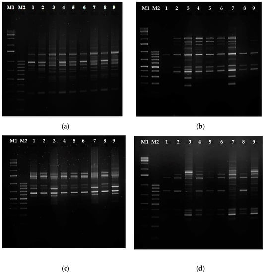 PCR analysis of genomic DNA isolated from Rindera graeca shoot and root lines: (a) RAPD primer OPA7; (b) RAPD primer OPA11; (c) SCoT17 primer; (d) SCoT30 primer; M1—molecular weight marker GeneRulerTM 1 kb DNA ladder; M2—molecular weight marker GeneRulerTM 100 bp DNA ladder; lane 1—RgS shoots, lane 2—RgAR shoots, lane 3—RgAR roots, lane 4—RgCR/NOA shoots, lane 5—RgCR/NOA roots, lane 6—RgTR7 shoots, lane 7—RgTR7 roots, lane 8—RgTR17 shoots, lane 9—RgTR17 roots.