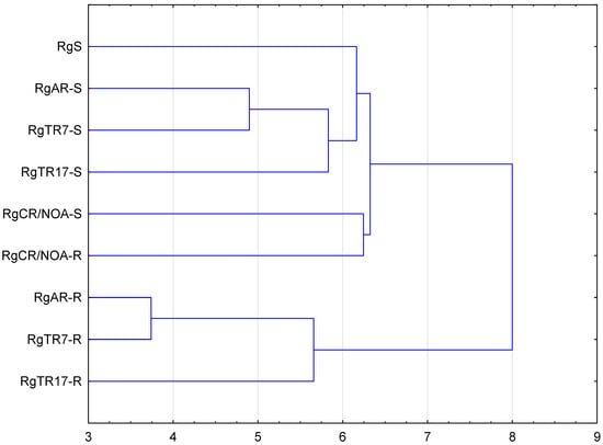 UPGMA agglomeration analysis of Rindera graeca shoots and roots cultivated in vitro: RgS—shoots derived from seeds; RgCR/NOA-S—shoots derived from RgCR/NOA roots; RgCR/NOA-R—auxin-induced roots regenerated from callus; RgTR7-S—transgenic shoots derived from RgTR7 hairy roots; RgTR7-R—hairy roots of the RgTR7 line; RgTR17-S—transgenic shoots derived from RgTR17 hairy roots; RgTR17-R—hairy roots of the RgTR17 line.