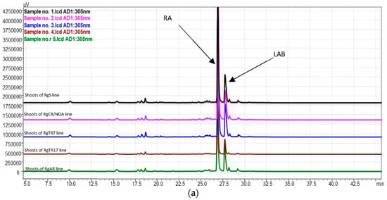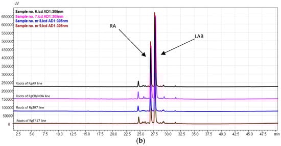 HPLC–PDA chromatograms (wavelength 305 nm) of (a) shoot samples and (b) root samples. RA—rosmarinic acid; LAB—lithospermic acid B.