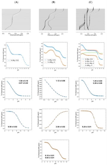 1H NMR pH titration spectra (top row) of NTA (A), EDTA (B), and EGTA (C) in the pH range 0.6–12.0, and pH values increasing from bottom to top with increments of 0.1 to 0.4 pH units, along with pH-dependent 1H chemical shift data (second row) as well as corresponding sigmoidal (bi-)dose–response fits (black lines) allowing for determining the pKa values, respectively, stated with the plots.