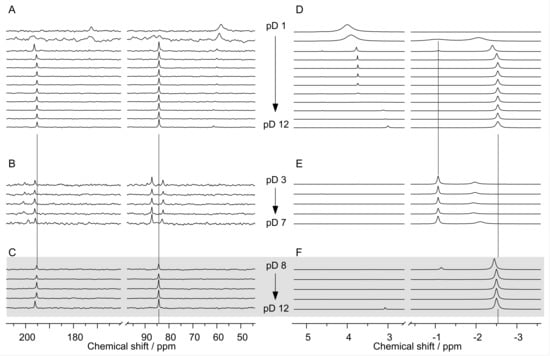 Solutions prepared with equimolar amounts of Eu(III) and NTA (18 mM each) showed a precipitate formation as of pD 8.0. Corresponding spectra of this series are shown in Figure 2B–F. For samples at pD 3.0–7.0 (Figure 2B,E), the spectra show the same two sets of signals. The absence of signals of unbound NTA indicates that both complexes associated with these two sets of signals possess a Eu(III)/NTA ratio equal to (or greater than) unity. The set comprising the signals at δC 196.2 and 87.2 ppm as well as a rather sharp 1H signal at δH −1.1 ppm refers to the Eu(III)–NTA 1:1 complex, and the signals at δC ~ 200.7 and 82.5 ppm as well as the broad 1H signal at δH −1.9 ppm are due to the 2:2 complex.