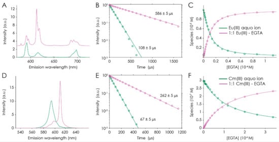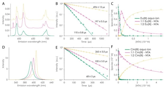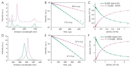 Similar experiments were performed for the actinide Cm(III). Owing to its excellent luminescent properties, a much lower concentration of 3 × 10−7 M Cm(III) could be used. As for Eu(III), the Cm(III) TRLFS data can be well explained with a three-species model. One difference between Cm(III) and Eu(III) emission spectra is that not only the intensity or shape of transitions is affected by ligands, but also the peak position itself. The three distinct maxima in the t = 0 emission spectra (cf. Figure 3D and Figure S15A, Supplementary Materials) are thus visible evidence for the three-species model. In the pH titration series at pH 2.4, the 6D7/2 → 8S7/2 transition of the Cm3+ aquo ion was visible as an emission band at 593.8 nm. Upon the increase in pH, a new emission band at 599.4 nm appeared (attributed to Cm(NTA)0, lifetime: (100 ± 5) µs), and a further increase in pH yielded a third emission band at 605.5 nm ([Cm(NTA)2]3−, (263 ± 5) µs). From their respective lifetimes, 5.6 ± 0.3 and 1.6 ± 0.5 remaining water molecules in the first coordination sphere of the Cm3+ ion were determined (see Equation (2)).